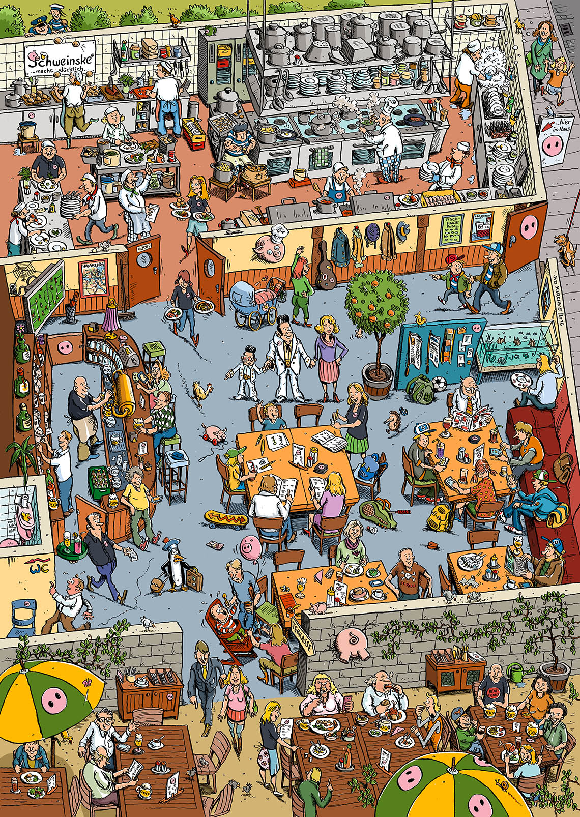 Wimmelbild für die Hamburger Restaurant-Kette Schweinske