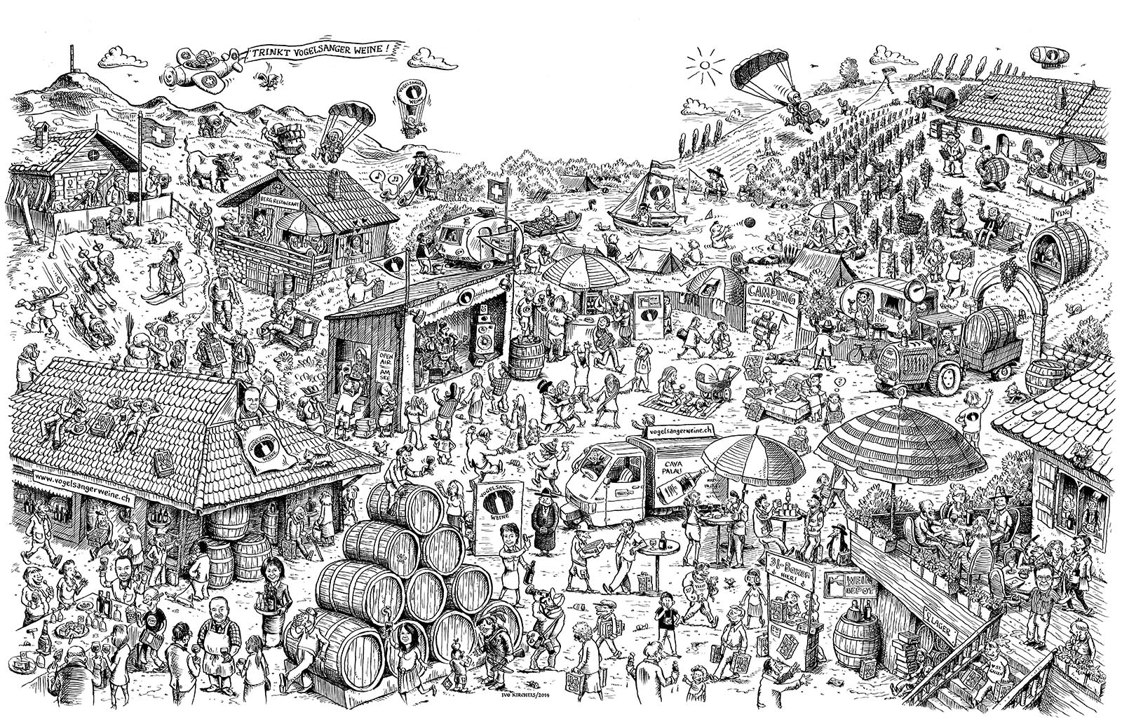 Das s/w-Wimmelbild zeigt witzige Szenen mit der Vogelsanger Wein-„Boxs“ vor typisch Schweizer Berglandschaft (Weinhandlung, Weinverkostung, Rockkonzert, Campingplatz am See, mobiler Weinverkauf …) sowie die porträtierten Mitarbeiter der Vogelsanger Weinhandlung. Es kommt als Verpackungsaufdruck auf 3l-Weinkartons für Rot- und Weißwein zum Einsatz.